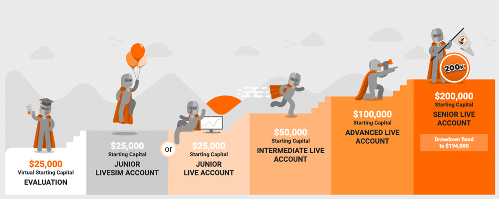 Gestartet wird mit einem 25k-Konto. Sobald man die Evaluierung in der ersten Stufe absolviert, bekommt man ein entsprechendes Live-Konto. Über die Stufen 25k, 50k und 100k gelangt man durch das Erreichen der jeweiligen Gewinnziele die Endstufe von 200k.
