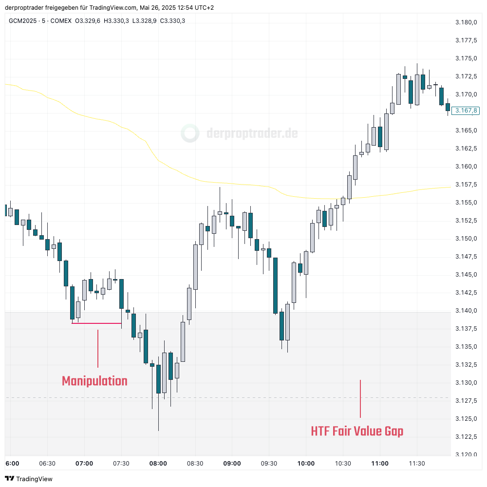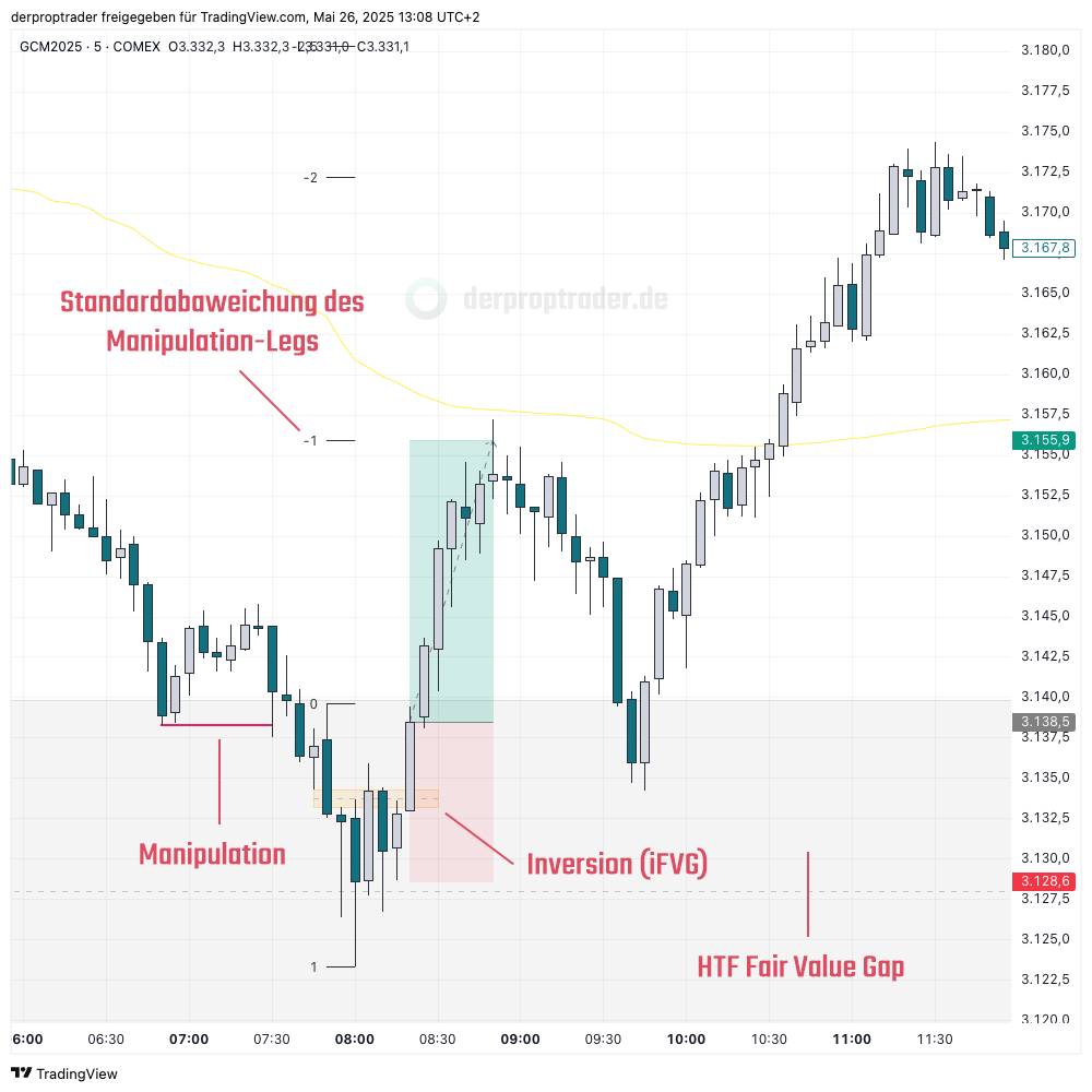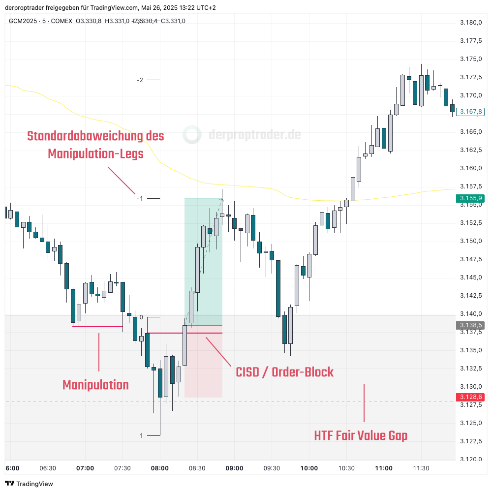 Dieses ist auch gleichzeitig das erste für mich sinnvolle Einstiegssignal. Sobald die M5-Kerze schließt, wird ein Long platziert. Den SL setze ich unter die Kerzenkörper. Auf dem M5 und besonders im Prop-Trading (mit Trailing-Drawdown etc.) setze ich gern mein erstes Target bei einem 1:1 Risk-Reward und das zweite und finale Target bei der -1 Standardabweichung des Manipulation-Legs.