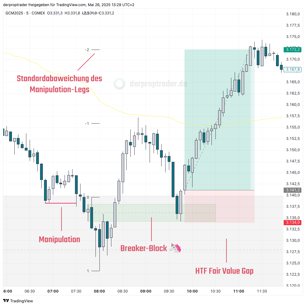 In diesem Beispiel handelt es sich sogar um ein Unicorn-Model, das durch den Breaker-Block und das überlappende FVG gekennzeichnet ist. Ausdauernde Trader können die -2 Standardabweichung als Target setzen. Mir persönlich reicht ein 1:1 und das lokale Hoch des ersten Aufwährtsimpulses.