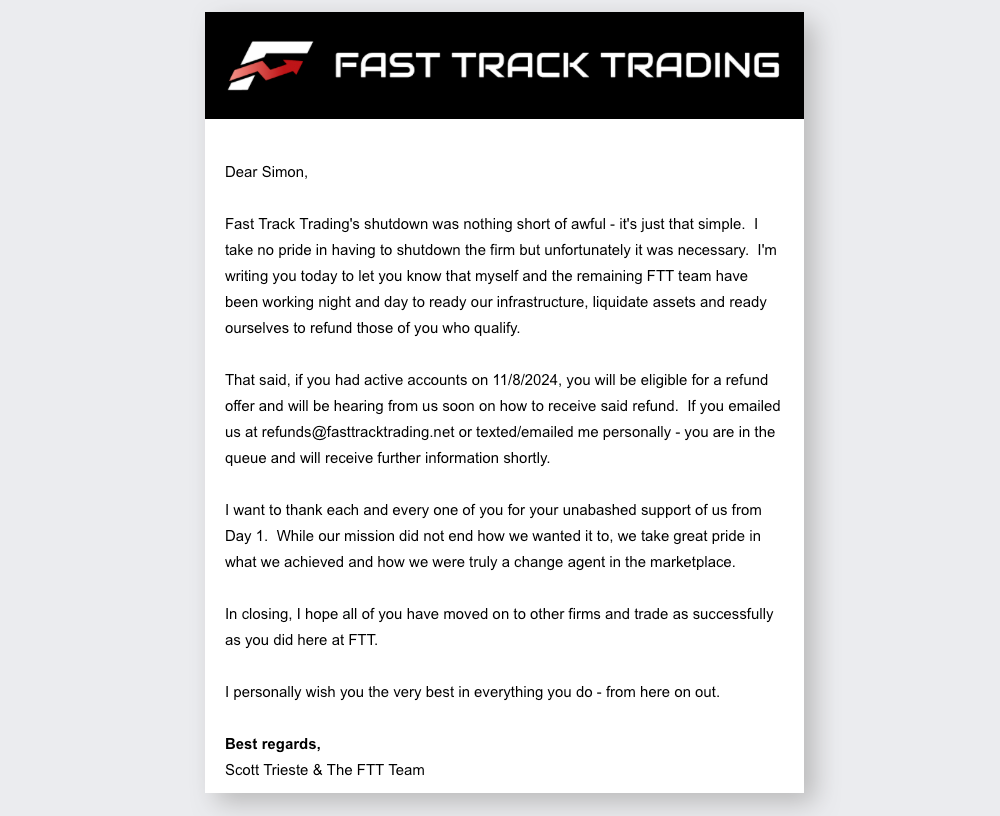 Gestern Nacht erhielt ich eine E-Mail von Fast Track Trading, in der Scott Trieste angibt, dass das Team hart daran arbeitet, allen das Geld zu erstatten, die am Tag des Untergangs 08. November 2024 aktive Konten hatten.