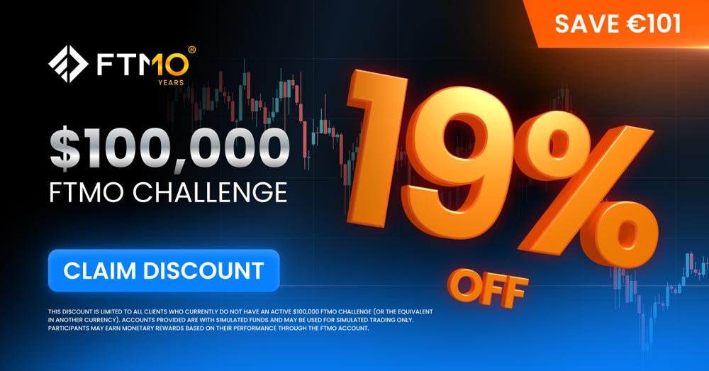 FTMO bietet zum 10. Geburtstag einen Rabatt von 19% auf die 100k Challenge an. Ein Rabatt – und noch dazu in dieser Größe – ist bei FTMO sehr selten. Ein Code ist für diesen Rabatt nicht notwendig.