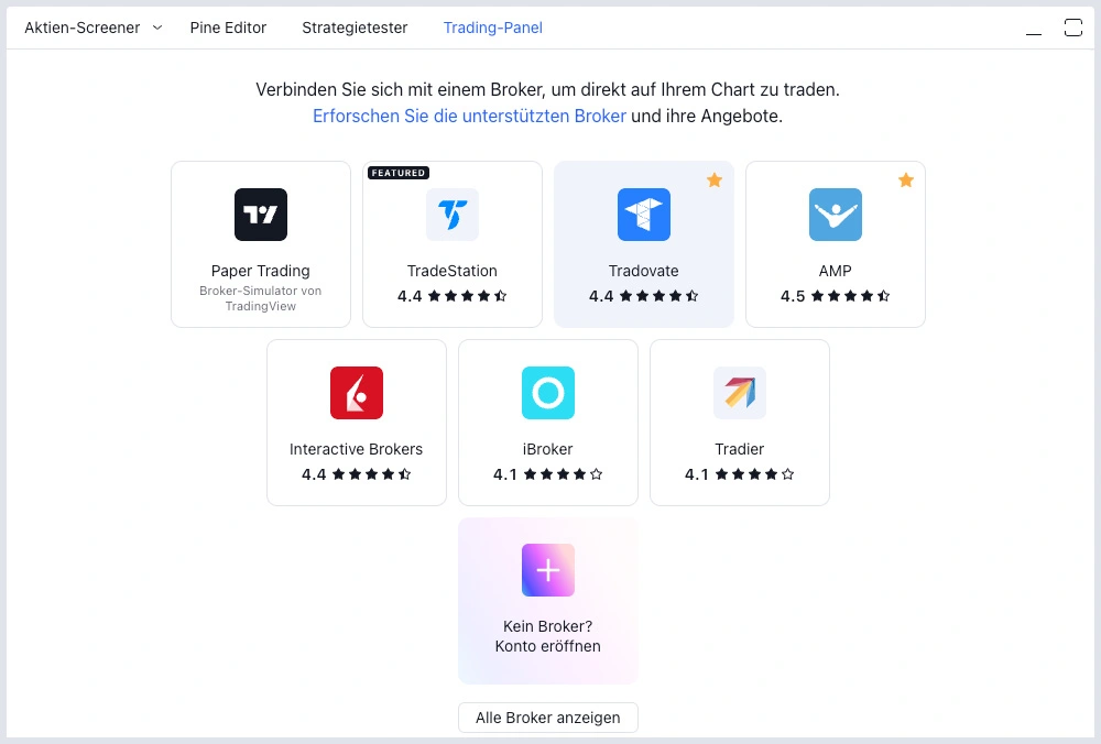 Bisher liefen die meisten Futures-Prop-Trading-Anbieter mit dem Ritmic-Datenfeed. Dieser ließ das Handeln direkt auf TradingView nicht zu. Doch vermehrt wird nun auch die Option Tradovate (Datenfeed CQG) angeboten. Tradovate hat eine direkte Schnittstelle für TradingView. Wenn wir unsere Challenge also mit Tradovate buchen, können wir das Konto bei TradingView als Broker verbinden und direkt auf der Plattform handeln.