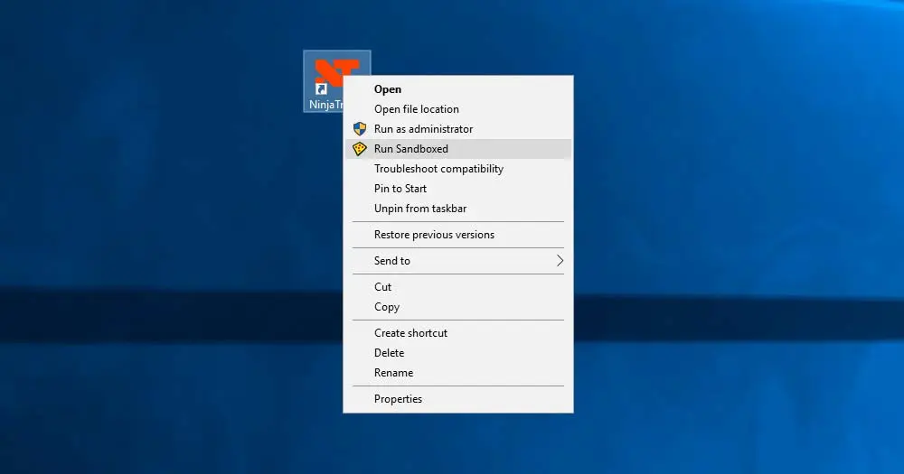 Diese Software namens Sandboxie ist kostenlos und kann sehr einfach installiert werden. Sobald eine Sandbox aktiv ist, können wir eine NinjaTrader Instanz wie gewohnt und eine andere in der Sandbox öffnen (Rechtsklick auf Desktop-Icon und “Run Sandboxed” auswählen). Außer dass die Fenster in der Sandbox zur Unterscheidung mit einem gelben Rand umgeben sind, wenn man mit der Maus darüber fährt, ist kein Unterschied zu bemerken. Es laufen also quasi zwei NinjaTrader nebeneinander. Nice.