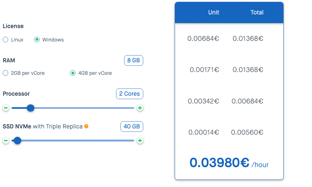 Ein Server mit Windows-Lizenz, 8 GB RAM, 2 Cores und 40 GB Festplatte würde 0.03980€ pro Stunde kosten. Überschaubar also!