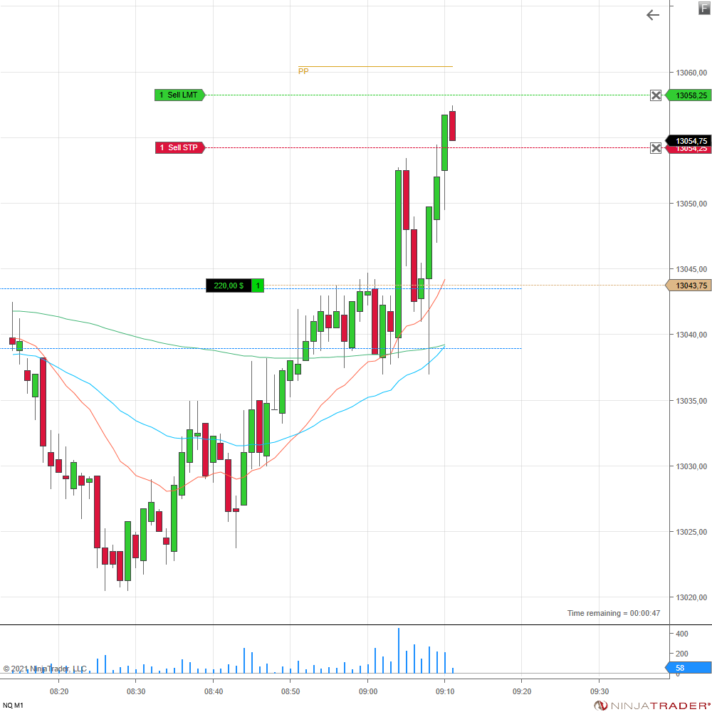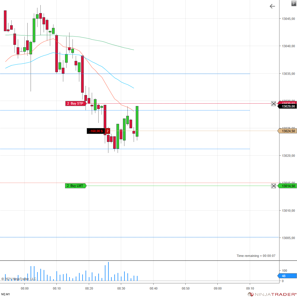 Ähnliche Situation ein paar Minuten später. Wegen des geringen Volumens war der 100er-Tick-Chart etwas langsamer als der M1 und lieferte mir so nach dem ersten Trade ein zweites Signal. Leider wollte der Nasdaq auch hier nicht so wie ich und stoppte mich relativ schnell aus. So schnell, dass ich nicht mal einen Screenshot machen konnte.