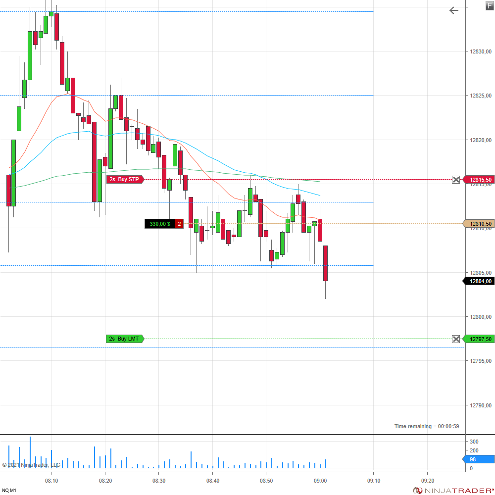 Diesen Trade habe ich ca. 10 Minuten vor Börseneröffnung platziert, da es auch oft vorkommt, dass dann schon ein Impuls kommt. Dieser kam diesmal erst pünktlich um 9:00 Uhr. In dieser Zeit bin ich um 2 Ticks fast ausgestoppt worden. Aber letztlich lief der Kurs wie erhofft in den Take-Profit.
