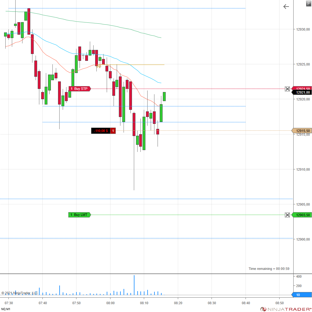 Heute hat mir meine Scalping-Strategie zunächst einen verkraftbaren (weil halbe Positionsgröße) Verlierer beschert. Danach hieß es Geduld zu bewahren, denn die Börseneröffnung hatte heute keine klare Richtung. Dann lief der Kurs nochmals die vorbörslichen Tiefs an. Bei diesem Short-Impuls konnte ich einen Pullback mitnehmen und schließlich mit +445$ Tagesgewinn in den Feierabend gehen.