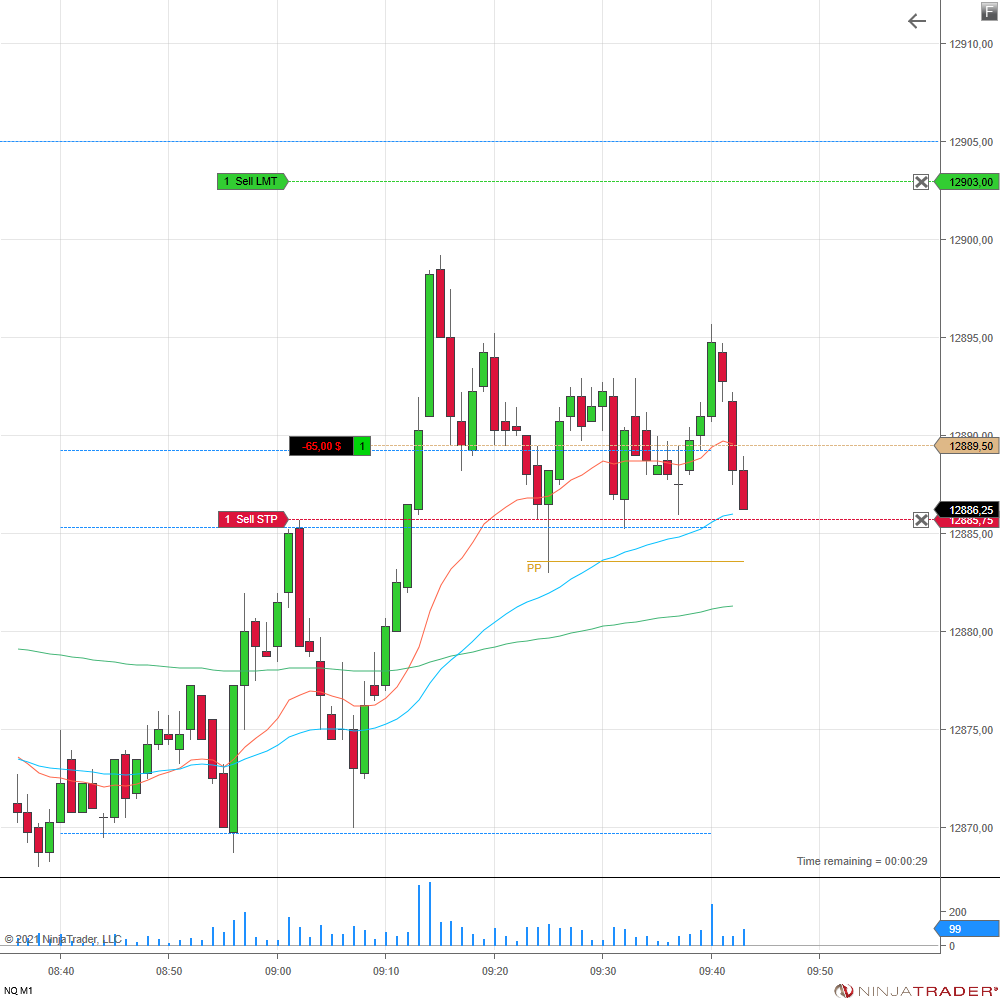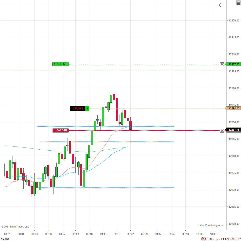 Nach dem ersten schönen Long-Impuls nach der Eröffnung wollte ich wie gewohnt den ersten Pullback mitnehmen. Im 100er Tick-Chart kam dazu das Signal. Leider fehlte dem Nasdaq dann die Luft für den zweiten Schub.