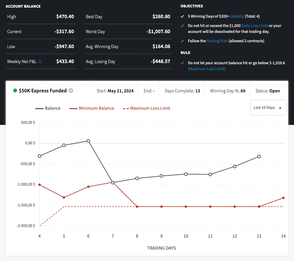 Die folgenden Tage hatte ich diesem Account und mir dann Micros verordnet, um mich mental erstmal wieder zu fangen. Leider durfte ich aufgrund des Skalierungsplans nur 2 Micros handeln, da es Topstep für die Rithmic-Umgebung noch immer nicht geschafft hat, 1 Mini mit 10 Micros gleichzusetzen. Drum ging es dann erstmal schleichend weiter.