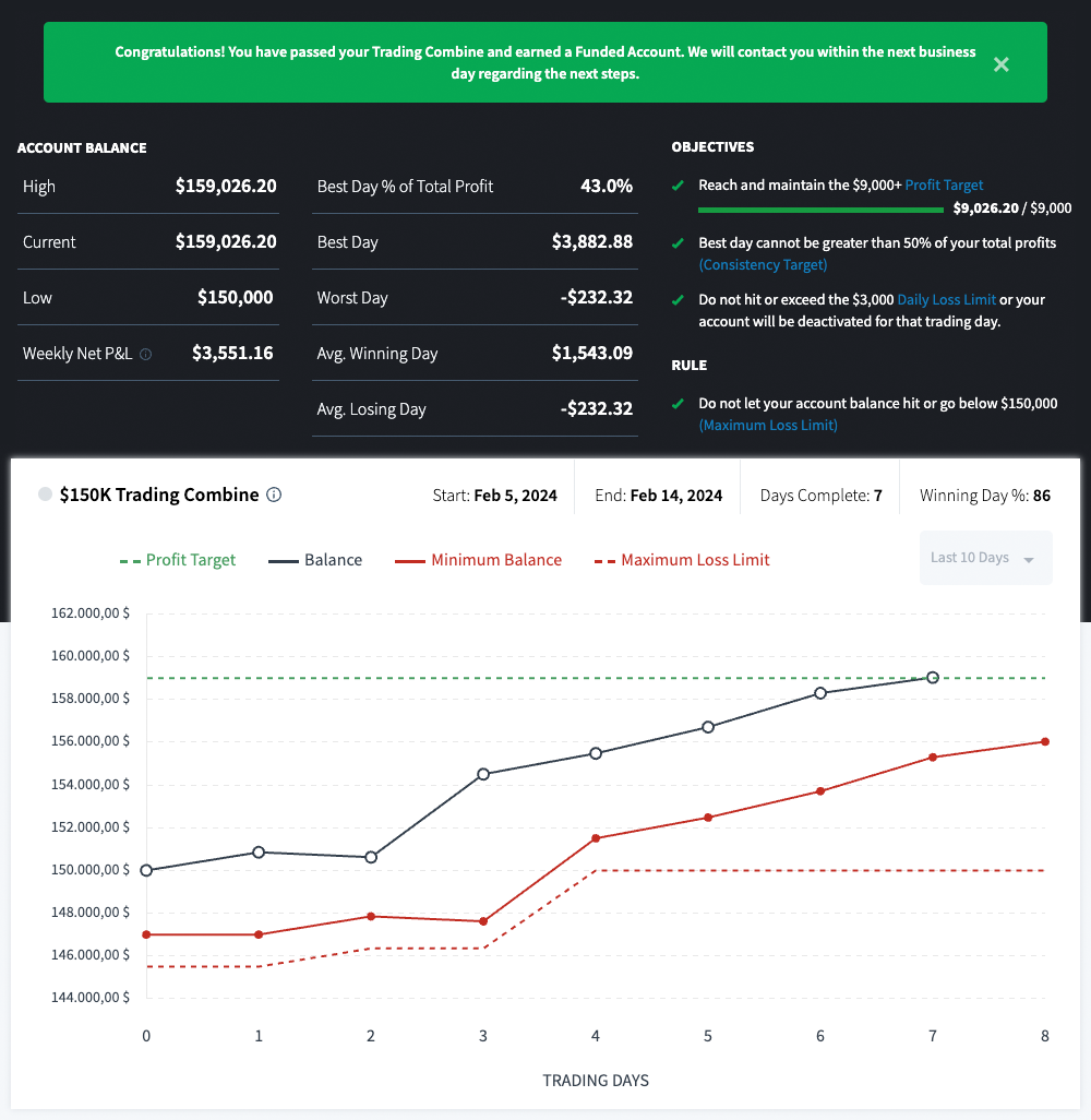 Um ein Trading-Konto von 150k handeln zu können, absolvierte ich die Combine bei der Prop-Trading-Firma Topstep und konnte diese vorgestern erfolgreich abschießen, indem ich das Profitziel von 9.000$ erreicht habe. Mein erster Versuch im Januar schlug fehl. Mir war jedoch wichtig, bei Topstep einen Funded-Account zu haben, da ich denke, dass sie zur Zeit zu einer der besten Firmen gehören.