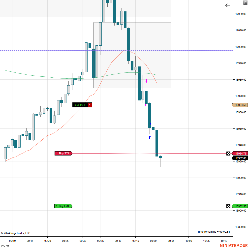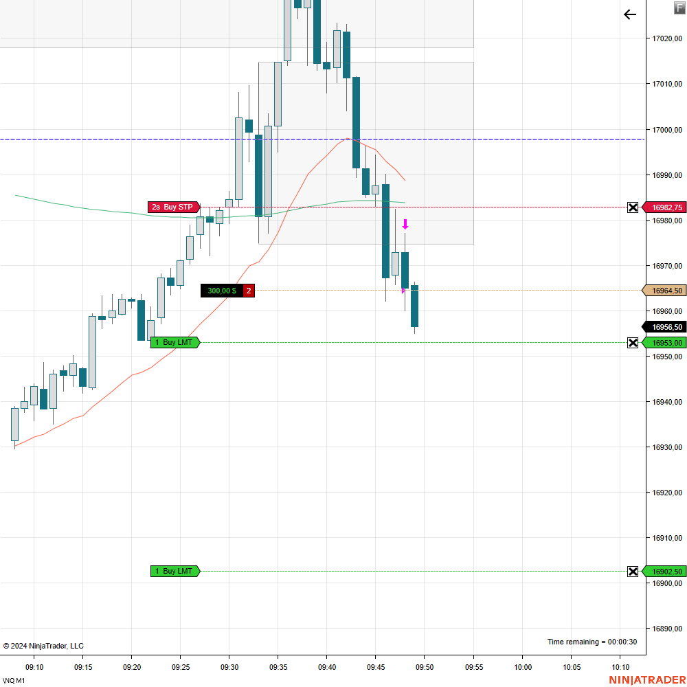 Nachdem wir nach der Eröffnung um 15:30 Uhr nicht wirklich nach oben durchstarteten, nahm ich in der Short-Bewegung ein schönes Stück mit diesem Momentum-Trade mit. Ein erster Take-Profit wurde erreicht. Beim zweiten Kontrakt habe ich den Stopp sehr aggressiv nachgezogen, weil noch starke Vola im Markt war. Etwas später erwischte ich mit einer Position einen zweiten Impuls auf wichtige Tiefs und konnte Profite etwas ausbauen.