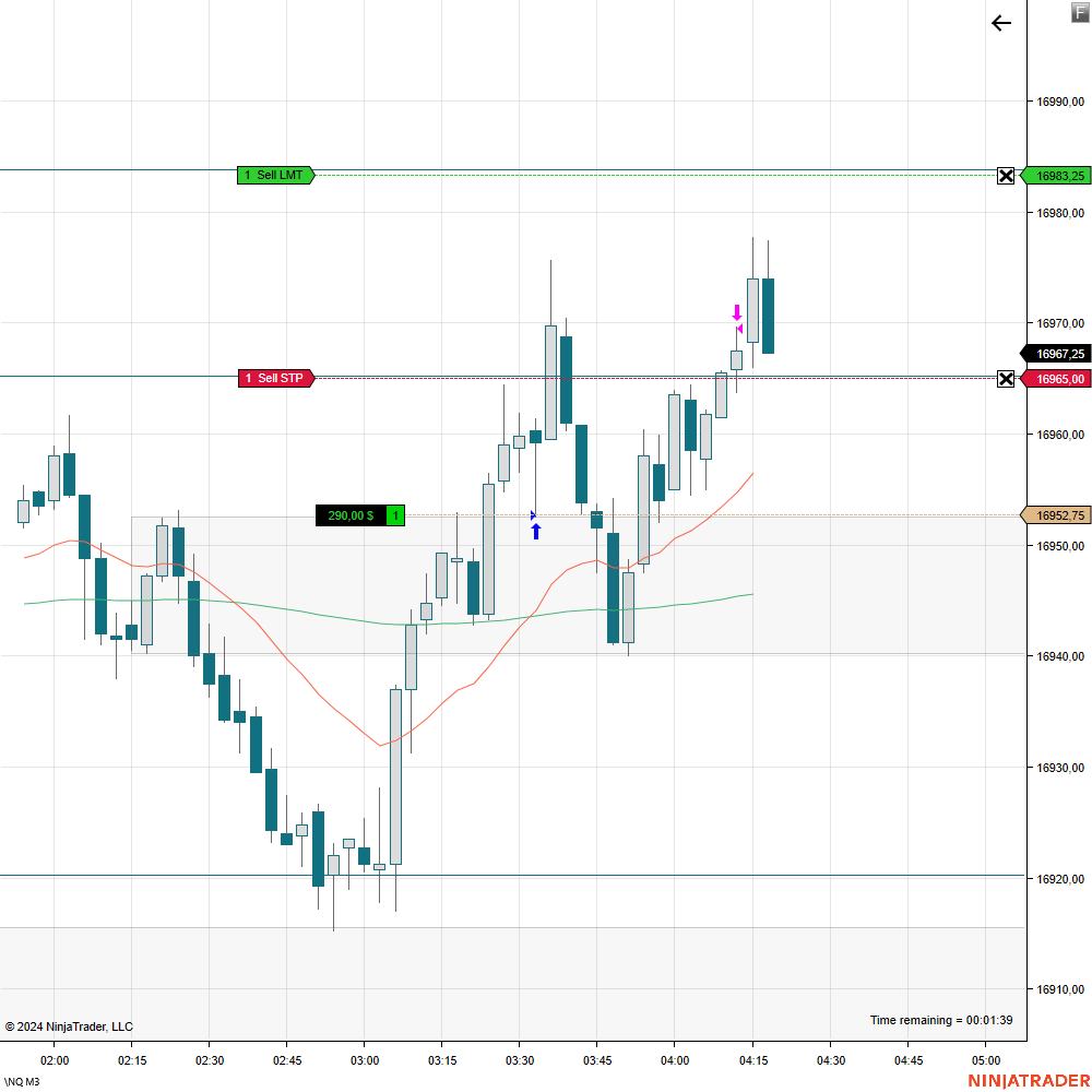 Da besonders der ES sehr stark gen Norden lief, machte ich auch schon nach dem kurzen Aufsetzer auf das FVG im H1 einen Long-Versuch mit einem Unicorn auf dem M3. Was erst nach dem perfekten Einstieg aussah, zog sich dann etwas hin und ich musste meine Ziele anpassen.