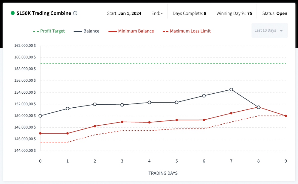 Heute habe ich in der Trading-Combine bei Topstep einen saftigen Verlusttag produziert. Da ich mit 4.500$ die Hälfte des Profitziels erreicht hatte, wollte ich ein wenig mehr riskieren, um das Ganze auch bald zu Ende zu führen. Das ging daneben, ist für mich aber in Ordnung, da ich das Risiko bewusst eingegangen bin. Das würde ich auf einem Echtgeld- oder Live-Konto nicht machen.