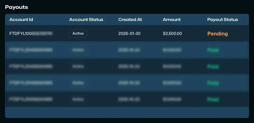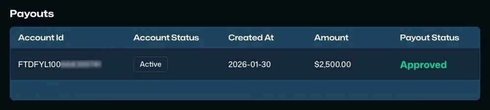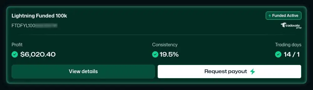 8:12 Uhr – Wenn der Kontostand eines Accounts das Gewinnziel erreicht und alle Regeln eingehalten wurden, wird dies zum Ende des Trading-Tages vom System erkannt. Am nächsten Morgen wird dann das entsprechende Konto im Dashboard grün hinterlegt und der Button Request Payout wird sichtbar.