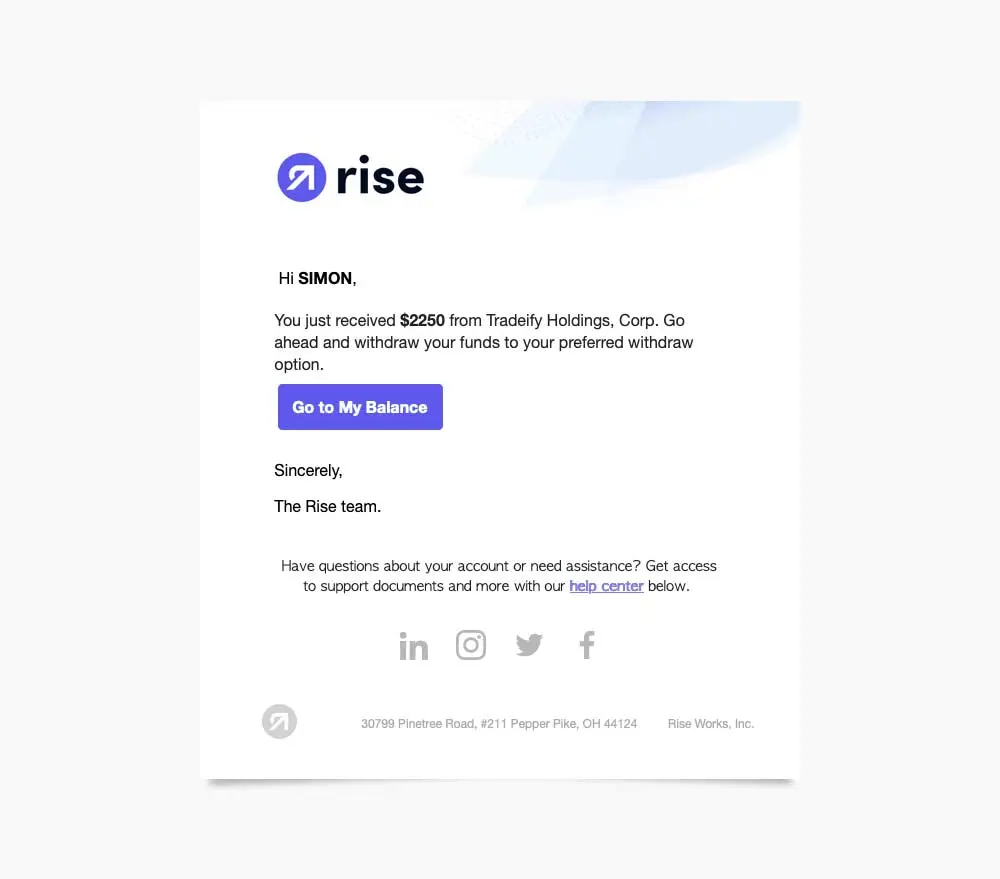 22:28 Uhr – Noch am selben Abend kam dann die E-Mail-Bestätigung von Rise, dass die Auszahlung von Tradeify dort eingegangen ist. Ab diesem Zeitpunkt ist das Geld also in unserem Besitz und kann vor dort aus auf ein Bankkonto oder auch per Krypto weitergeleitet werden.
