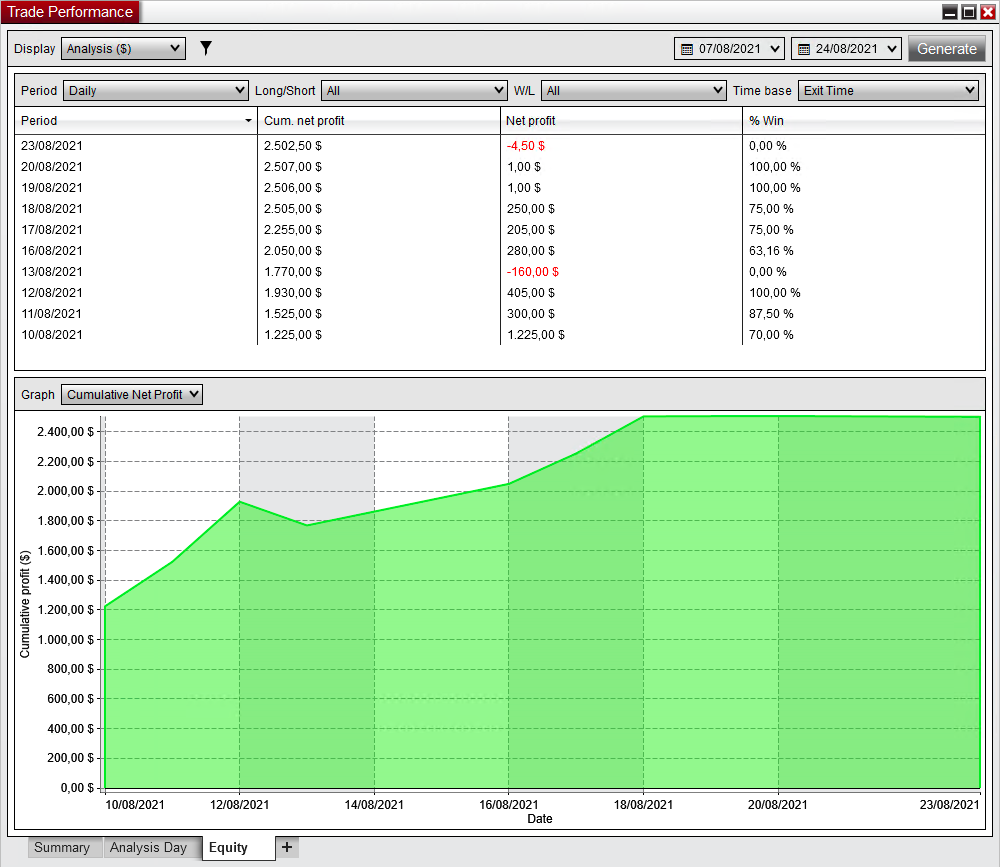 In dieser Evaluierung hatte ich lediglich einen echten Verlusttag, der mit 160$ unter Andwendung meiner oben genannten Regel sehr klein ausfiel. Geholfen hat natürlich mein erster Tag mit einem Gewinn von 1.225$, der den Zeitdruck in der Evaluierungsphase minderte und dafür sorgte, dass ich das Gewinnziel bereits an Tag 7 von 10 erreichen konnte.